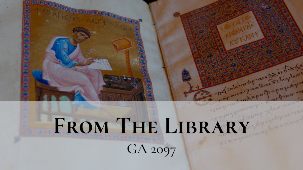 This From the Library blog features an eleventh-century Gospels and commentary manuscript. This manuscript named Gregory-Aland (GA) 2097 has a unique story to tell. It belongs to the Library of the Hellenic Parliament in Athens, Greece, where I had the privilege of digitizing it with Andrew Bobo as part of CSNTM’s expedition in 2017. While we know little about GA 2097’s background, a closer inspection of the text and the artifact itself sheds light on the ways its owners read the Gospels.
