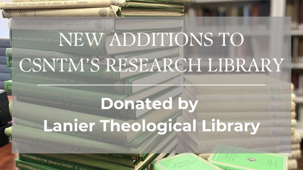 The Lanier Theological Library, one of the premier theological libraries in the country, generously donated over 1,000 books to the Center for the Study of New Testament Manuscripts (CSNTM). When visiting the library to receive the donation, the CSNTM research team came upon a treasure trove: personal libraries once owned by renowned Jewish Hebrew Bible scholars, including that of Alon Goshen-Gottstein, alongside a wide array of books from various places. Amidst these collections, the team identified a wealth of resources on the Hebrew Bible, many of which pertain to the Dead Sea Scrolls and the Biblia Hebraica Stuttgartensia. Throughout were numerous scholarly resources on the New Testament, as well as significant monographs in the broader field of New Testament studies. Although the vast majority of the donated books are not exclusive to New Testament text critical resources, they are instrumental in advancing CSNTM’s ambition to develop the most robust New Testament text critical library in North America.