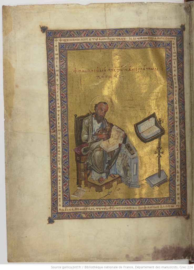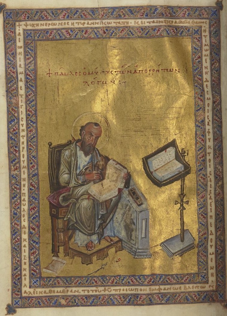 This particular manuscript, also known as GA 1934, has all the epistles of Paul. Also, it is beautifully illuminated—it has full-page images with gold background and detailed frames, as well as intricate headpieces at the beginning of each biblical book.