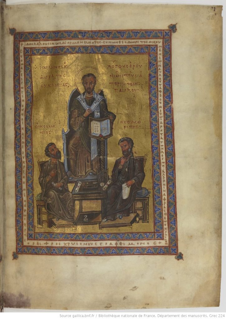 Interestingly, if you flip the pages of this manuscript, you will see the names of Oecumenius and Theodoret next to the marginal commentaries on the biblical text. This means they are relaying to the reader the interpretation of the text. However, as communicated by this picture at the beginning of the manuscript even before the biblical content and the associated commentary, the interpretation is ultimately that of Chrysostom. Chrysostom is the trumpet thunder, to whom Paul whispered his words and who proclaims them across seas and lands (see GA 1933).